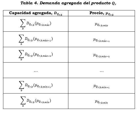 a) Con base en las capacidades DQr,b ( PQr,b ) y en los precios PQr,b el subastador determinará la curva de demanda agregada para Qr la cual se formará conforme a lo establecido en la Tabla 4 de este Anexo.