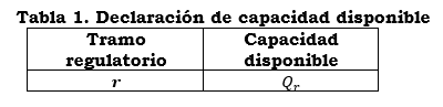 En el día y hora que determine el administrador de la subasta el transportador de gas natural deberá declarar la capacidad disponible para la subasta, tal como se muestra en la la Tabla 1.