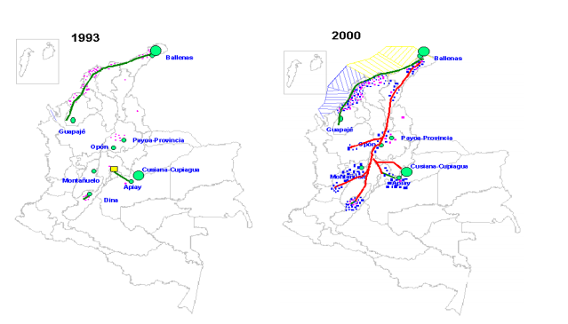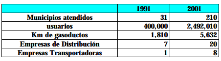 Como resultado de la política de masificación de gas y del nuevo marco legal, actualmente se presta el servicio a más de 2 millones de usuarios en todo el país, en más de 200 municipios. Se construyeron cerca de 3,600 Km de red de gasoductos, y asíselogró completar la infraestructura de transporte necesaria para unir los grandes centros urbanos del interior con los campos de producción y se constituyeron en el transcurso de diez años (1991 – 2001) 13 empresas de distribución de gas, de las cuales 9 distribuyen gas en 129 municipios del interior del país. Las cifras y los mapas que se incluyen a continuación ilustran dicha expansión y resultados.