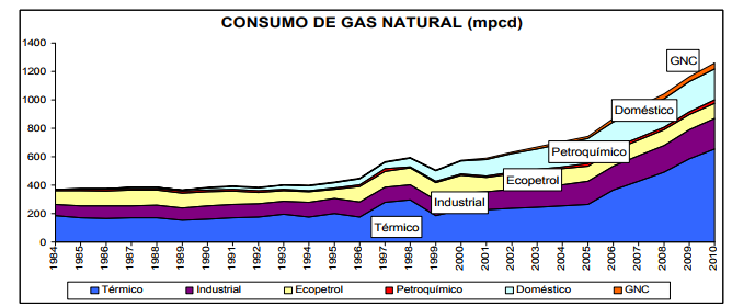 De acuerdo con las proyecciones de demanda (UPME, 2001) se espera que en el año 2010 el consumo sea 1.200 millones de pies cúbicos por día (mpcd), triplicando el registrado en el año 1984. La Gráfica muestra la evolución de la demanda, destacando el potencial de crecimiento del sector doméstico y de las plantas de generación de electricidad. También en el futuro será muy importante el uso del gas como combustible automotor.
