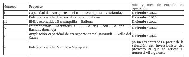 Así mismo, en el numeral 1.2 del artículo 1 de la resolución en mención, se incluyen los proyectos que no se encuentran embebidos en la infraestructura de un sistema de transporte existente, y las fechas en las que cada proyecto debe entrar en operación: