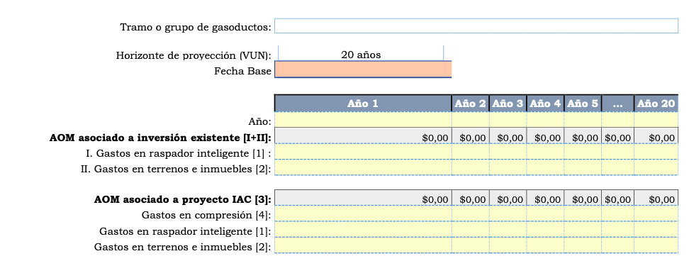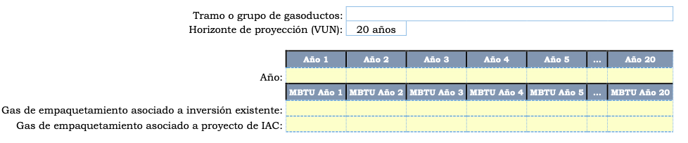 [1] Se deben agregar las filas necesarias para incluir los proyectos (IAC) existentes en el respectivo tramo o grupo de gasoductos. A cada proyecto se le debe asignar un nombre.