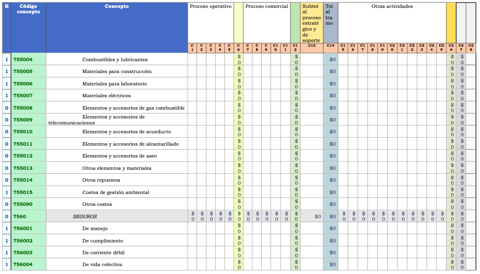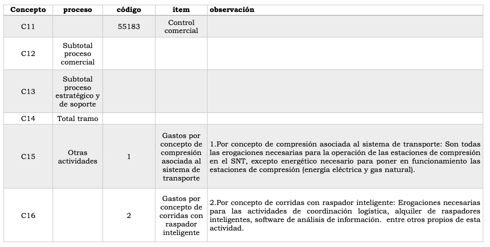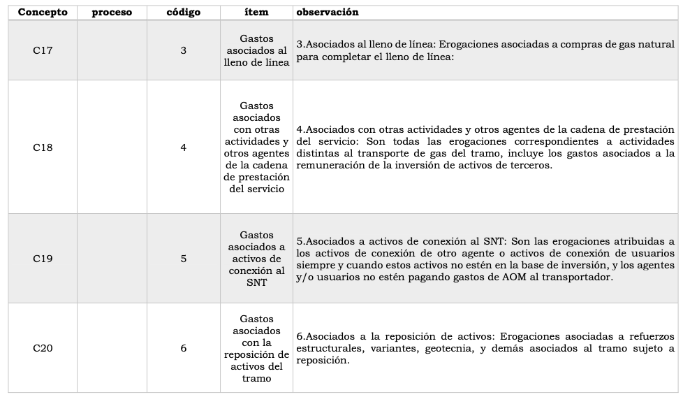 [3] Gastos de AOM de acuerdo con lo establecido en la presente Resolución. Se deben agregar las filas necesarias para incluir los proyectos existentes en el respectivo tramo o grupo de gasoductos. A cada proyecto se le debe asignar un nombre.