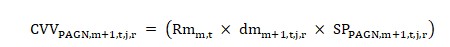 Valor a facturar en el contrato de transporte r del Mercado Primario, al beneficiario j, en el nodo de referencia p identificado por la UPME, en el sistema de transporte t, en el mes m+1, por el servicio prestado por confiabilidad en el mes m, por el proyecto PAGN. Dado en pesos/mes.