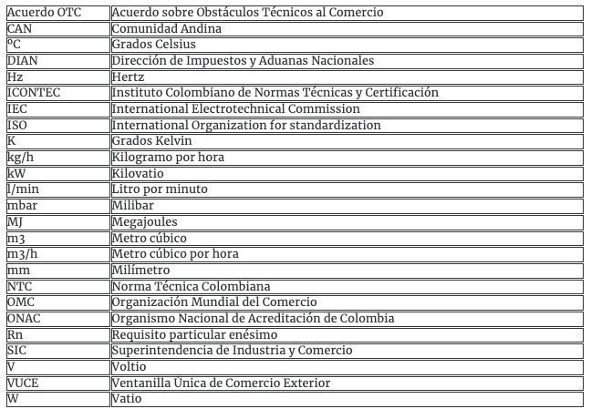 Las siglas y unidades que aparecen en el texto del presente reglamento técnico tienen el siguiente significado: