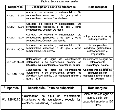 A continuación se relacionan las subpartidas arancelarias del Decreto 4589 de 2006, o en la disposición que en esta materia lo modifique, adicione o sustituya, en las que se clasifican los gasodomésticos objeto del presente reglamento técnico: