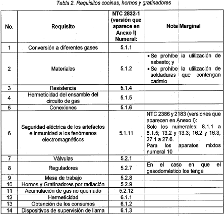 Clasificación de los gases y los gasodomésticos: La clasificación de los gases y de los gasodomésticos para cada artefacto se encuentra, según corresponda, en la Norma Técnica Colombiana NTC-2832-1 - Gasodomésticos para la cocción de alimentos, Norma Técnica Colombiana - NTC 3531 - Calentadores de paso continuo, y Norma Técnica Colombiana - NTC 5042 - Calentadores tipo acumulador, versiones que aparecen en el Anexo I.