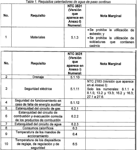 Norma Técnica Colombiana - NTC 3531. Artefactos domésticos que emplean gases combustibles para la producción instantánea de agua caliente. Calentadores de agua de paso continuo. Quinta actualización, 2021-05-19.