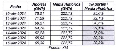 Que, dadas las condiciones actuales de los aportes hídricos al sistema, reportadas durante la semana del 10 al 16 de abril, se han registrado valores inferiores al 30% en los últimos 4 días y con una tendencia decreciente; lo cual ha llevado al embalse agregado del Sistema Interconectado Nacional (SIN) a mínimos históricos, con un dato a 16 de abril de 2024 de 29,09% de volumen útil.